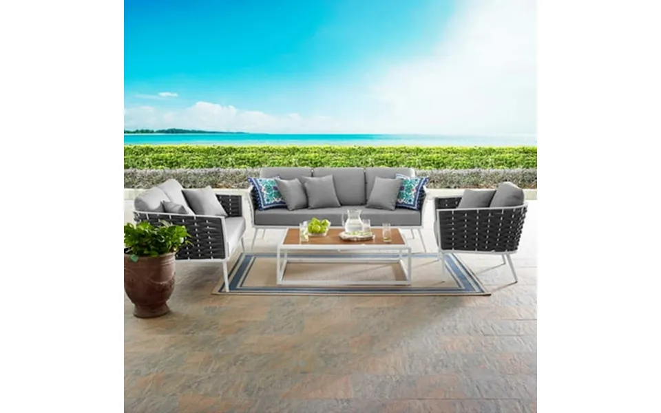 Gather family and friends for pleasant weather and good conversation with the stance outdoor collection. Boasting a contemporary modern look stance features woven polyester fabric rope seat back and flared powder-coated aluminum frame slatted synthetic wood tabletops and waterproof all-weather fabric cushions with plush 5 thick dense foam padding provide a relaxing spot to lounge. A versatile set designed for long-lasting durability each piece in the stance collection can be mixed and matched and effortlessly arranged to fit the spontaneous needs of you and your guests. Cushion thickness: 5 h. Chair weight capacity: 331 lbs. Sofa weight capacity: 551 lbs.Set includes:one