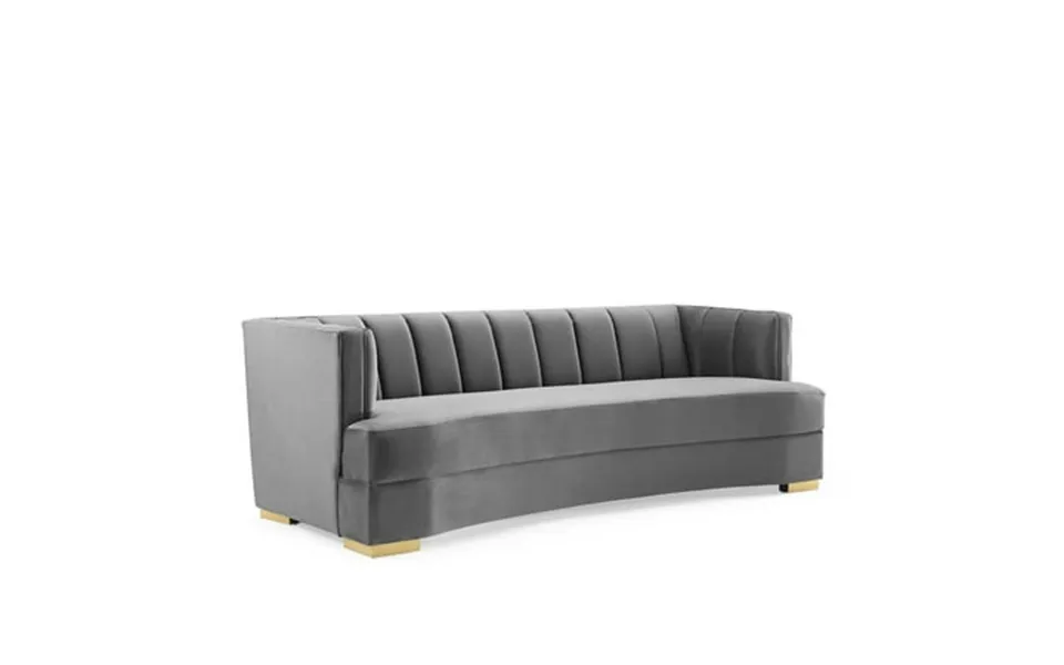 Bring the encompass curved channel tufted performance velvet curved sofa to your living room and claim center stage with the glam deco elegance. Encompass has a linear back and arms enhanced with interior vertical channel tufting accents. The curved seating expanse adds a welcoming appeal to the velvet couch. The encompass living room sofa has densely padded foam cushions covered with luxuriously soft stain-resistant performance velvet polyester upholstery creating a lushly comfortable seat. Four gold stainless steel legs with non-marking foot caps support the encompass couch. Assembly required. Sofa weight capacity: 600 lbs.