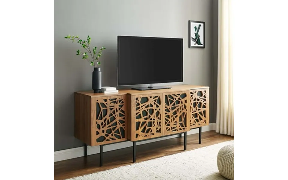 Encompass modern style and organic aesthetics with the telluride sideboard. Featuring a beautiful nature-inspired design this wooden sideboard brings stylish functionality to a dining space entryway or living room and it s versatile design allows it to double as a tv stand or display stand as well. Telluride is crafted with mdf and walnut wood veneer and rests on powder-coated iron tube legs. Featuring a breezy design for flow-through ventilation this versatile media center is complete with adjustable-height shelves front doors with soft-close hinges anti-toppling straps a cable management hole and sliding doors that make up the back panel that can also be removed completely. Keep visual space clean with the ample storage space of this credenza perfect for home essentials media equipment silverware dishes and other dining room finery. Please note: when placing the tv directly on the unit we recommend anchoring it in place.