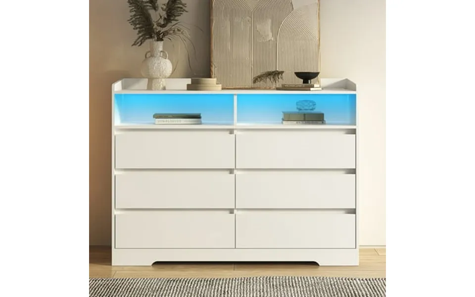 Resenkos 6-drawer dresser with rgb led lights is particle board of durable and environment-friendly mdf wood honeycomb structure for long use life eco-friendly material provides you and your family a safe and healthy environment. Led lights make the drawer dresser look prettier in the dark and add a unique vibe to your bedroom. All exposed surfaces are fully treated to add an elegant touch to any space. As a functional furniture this simple style tall dresser emphasizes functionality. Six drawers of the same size and 2 open storage compartments will satisfy most everyday storage needs as well. The white dresser has a modern minimalist design with its solid wood frame finish and hidden handle decorated drawers making it fit easily with most home decor. Not just a bedroom dresser you can also use it as a dresser tv cabinet in the living room a nursery dresser in the baby s room or in your kids bedroom with its minimal style. Resenkos resenkos 6-drawer double dresser chest of drawers storage unit in white product name: 6 drawers dresser overall dimension: 15.75 D x 51.18 W x 38.58 H. Drawers included: 6