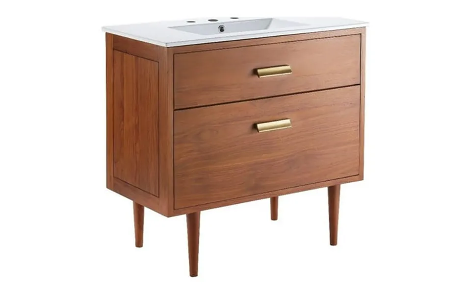 Bring mid-century inspiration and organic tropical aesthetics into a bathroom space with the cassia 36 bathroom vanity. Featuring a clean-lined design and brass metal hardware this vanity is durably crafted with solid teak wood with a faux front door for added interest. Raised off the ground by retro tapered legs this bathroom vanity features ample storage in its spacious bottom drawer to accommodate bathroom essentials. Featuring a ceramic sink basin with 8-inch centerset holes and an integrated counterop this wood vanity aligns style with function in a modern bathroom. Inludes non-marking foot caps. Assembly required. Fixtures not included.
