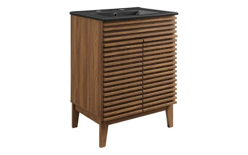Tap into mid-century aesthetics with the render vanity. Render bathroom vanity features a durable particleboard frame with smooth laminate four tapered wood legs and adjustable storage shelf behind two soft-close hinged doors. A curved ceramic basin and integrated countertop with three faucet holes create sleek lines and crisp design for an edgy style designed to meet your needs. Boasting a mid-century modern style this vanity features a solid construction with a pleasing look and practical functionality. 8 Centerset faucet holes. Assembly required and fixtures not included. Features: material: wood particleboard ceramic finish: walnut black mid-century modern style adjustable storage shelf dual soft-close doors 8 centerset holes integrated countertop particleboard and laminate construction specifications: product dimensions: 33.5 H x 24 w x 18.5 D product weight: 78 lbs
