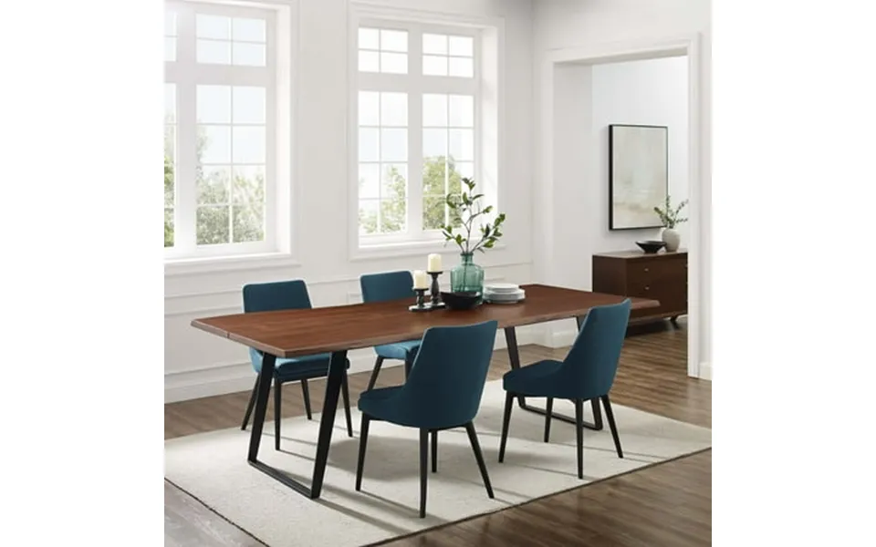 Dine converse relax and entertain all while seated around the viggo rectangular dining table. Featuring a live edge tabletop crafted with planks of solid acacia wood with butterfly joints making each piece unique this dining table is brimming with natural beauty and modern style. The dining table sits on splayed u-shaped legs crafted with powder-coated metal and abounding in striking angular detail. Designed for everyday dining or entertaining this versatile table measures 96 long and effortlessly accommodates ten dining chairs. The spacious tabletop can also serve as a functional conference table in a modern apartment. Includes non-marking foot pins to protect flooring.