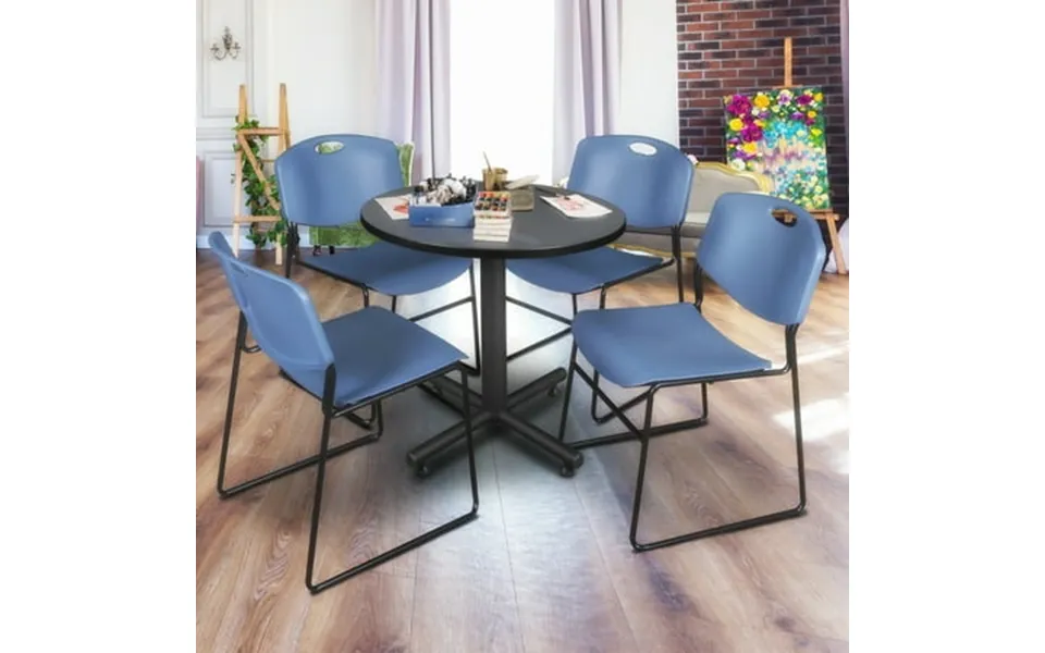 The elegant kobe collection puts the class in classroom. These versatile tables are at home in stylish restaurant settings as well as classrooms breakrooms and more. This 30-inch round table is constructed of a thermal fused melamine laminate tabletop that is 1-inch thick and finished with a black t-mold edge band. This grey tabletop is double-sided and finished in mahogany on the other side. Simply pick the side you like and install the base on the other. Self tapping wood screws and a placement template are included. Laminates are scratch stain and scald resistant and wipe clean easily. The base is constructed of a black tubular steel x-base and is protected with a black powder coated finish for a uniform matte finish. Adjustable glides on the bottom that raise the whole base off the ground give the kobe collection an open modern look. Kobe table bases are backed by a 10-year limited manufacturer s warranty.