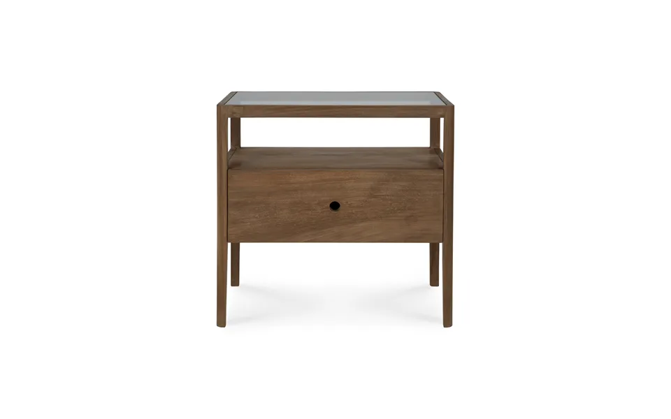 Functionality meets design in this glass top teak nightstand by ethnicraft. Crafted from solid oak, the spindle bedside table offers a single drawer and an open space that provide a spot to neatly place personal items, reading materials, or any nighttime necessities within easy reach. Its slightly tapered legs and a sleek glass surface, exuding a sense of modern refinement. Pairing perfectly with the spindle bed, this bedside table completes the ensemble, bringing coherence and unity to your bedroom decor. W22 x d14 x h21 in weight 33 lbs w56 x d36 x h53 cm weight 15 kgs material 100% solid wood reclaimed teak 2-year warranty & exclusive belgium design download technical line drawing download assembly instructions download care instructions