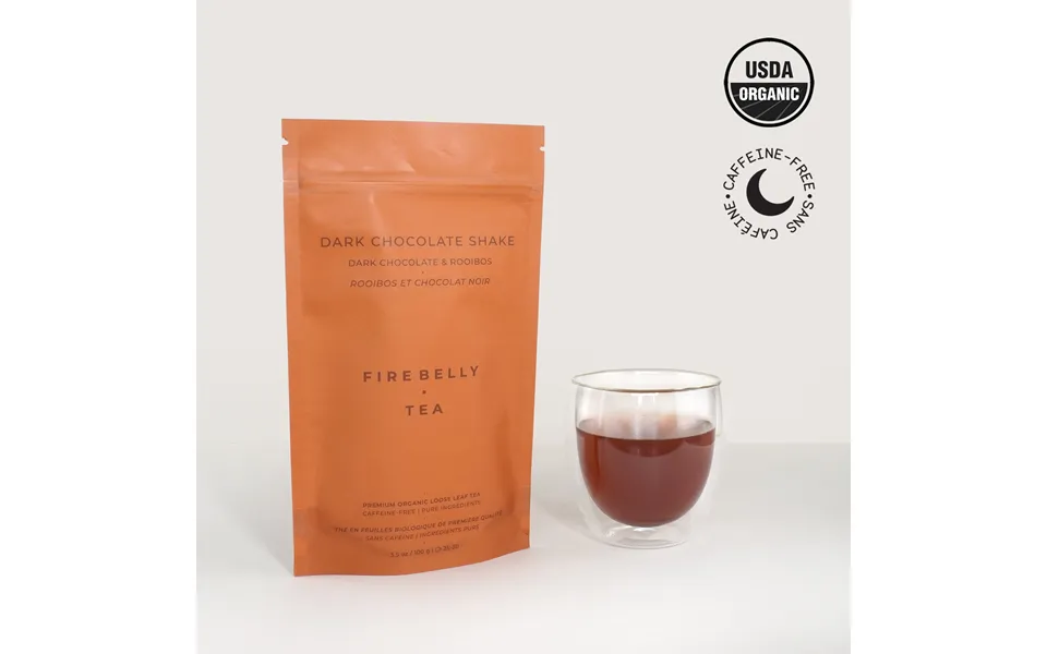 Dark chocolate herbal infusion. We love the way this tea wins everyone over. Just the right amount of sweetness, and rich, thick, chocolatey goodness it feels like drinking a cup of hot cocoa, except that you still feel great after the last sip. If you've got a sweet tooth, you'll be surprised by how a cup of dark chocolate shake can satisfy that craving.. Caffeine-free herbal tea with real chocolate. Guaranteed to surprise you, and become a favorite. Chocolate flavor gets richer with longer steep times.. Ingredients:. Cocoa husk, cocoa bean, cocoa powder, barley malt, rooibos, sweet blackberry leaves, liquorice root. Crafted with 100% pure ingredients. No added sugar, flavorings, preservatives, or anything else.. Benefits:. Cocoa is high in antioxidants.. Licorice root helps support healthy digestion.. Weight:. 3.5Oz 100g. Makes 25-30 cups.