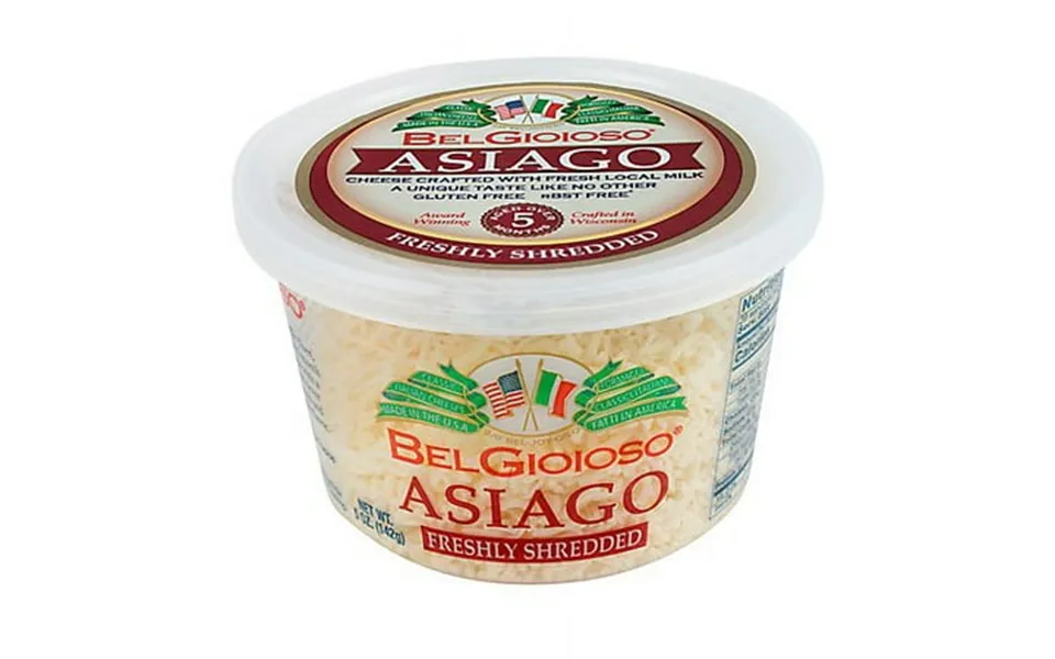 Belgioioso shredded asiago cup 5oz pack of 12 .Cheese crafted with fresh local milk a unique taste like no other. Gluten free. Classic. Italian cheeses. Rbst free no significant difference has been found in milk from cows treated with artificial hormones . Award winning. Aged over 5 months. Asiago begins with local fresh milk. Then careful handcrafting and minimum 5 month aging produce a sweet nutty flavor with a hint of sharpness that satisfies but never overpowers. Melt over grilled meats and vegetables or add to pasta for extra flavor. Belgioioso.Com. Made in the u.S.A. Crafted in wisconsin.