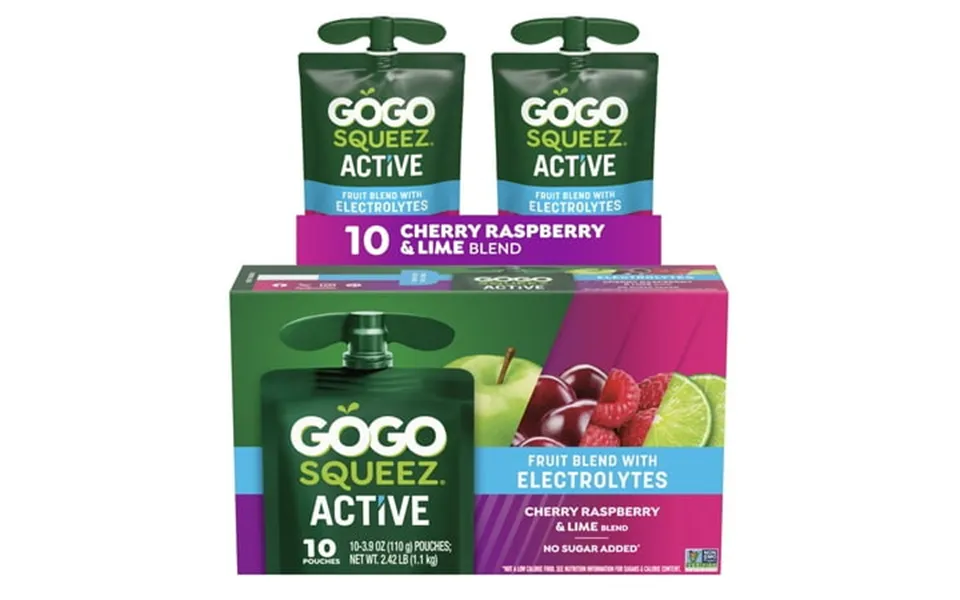 Keep the fun going with gogo squeez active fruit blend with electrolytes a sports snack made for an active lifestyle. This tasty snack is powered by real fruit contains antioxidants vitamin c vitamin a and vitamin e and is made with electrolytes. With no sugar added* and a gluten free recipe gogo squeez active fruit blend with electrolytes is a snack you can feel great about. The best part these pouches are 20% bigger for even more deliciousness to squeeze out and snack on. Stock up for the big game or a short hike with our other delicious flavors: blueberry strawberry lemon and strawberry pineapple orange. *Not a low calorie food. See nutrition information for sugars and calorie content. Fruit blend with electrolytes 3.9 Oz. Regular pouch 3.2 Oz