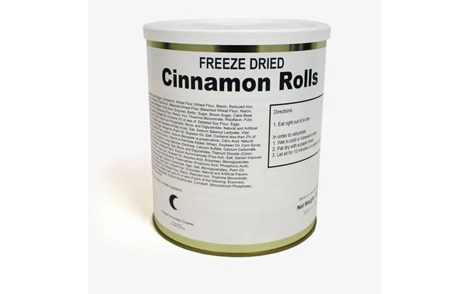Ftf technologies freeze dried cinnamon rolls 40 per can last 25 years. Freeze-dried cinnamon rolls: store long-term you ll be ready for anything with a food supply that will last and be there when you need it most. Our cinnamon rolls are freeze dried so they can be stored long term and without needing refrigeration lasts longer than dehydrated and traditional canned food . Perfect for emergencies just rehydrate then enjoy. 25 Year shelf life. About 40 cinnamon rolls per can. Eat right out of the can or simply rehydrate to enjoy like regular cinnamon rolls. Every can is sealed in an oxygen moisture free environment. Store in a cool dry place. Packaged in 10 size can gallon can . Net wt 28 oz. Manufactured procured and packaged in usa. Helpful hint: store a can opener with your cinnamon rolls so you have it when you need it.Directions: to rehydrate the rolls just wet them in the water milk coffee tea or any other beverage of choice and let them sit for 10 minutes in a sealed container zip lock bags work great . You can also rehydrate them with steaming. Then use as a delicious dessert. Once opened they will last: up to 1 year in a zipper locking bag with refrigeration once opened but not rehydrated. Up to 60 days in a zipper locking bag without refrigeration once opened but not rehydrated. Up to 5 days in the refrigerator once they re rehydrated. When will your freeze-dried food expire the manufacturer guarantees the minimum shelf life of 25 years from when the food was mad...