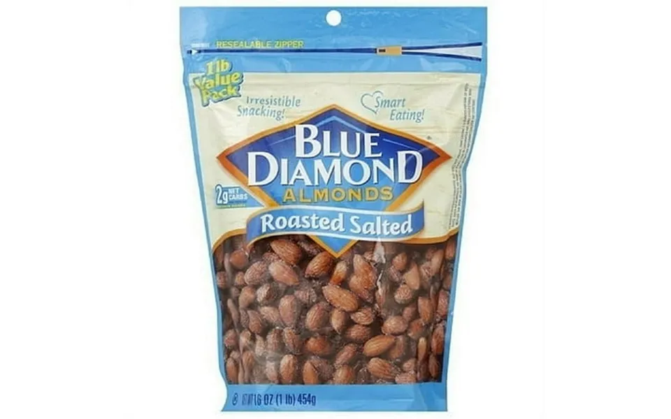 Enjoy a tasty snack with blue diamond roasted salted almonds. They are both nutritious and delicious. Roasted with just the right amount of salt they offer a mouthwatering flavor. You can serve them as a healthy snack or use them as an addition to meals. These roasted almonds have only 2 grams of carbohydrates in each serving. They are also low in saturated fat and cholesterol while still providing plenty of protein. You can add them to a variety of recipes for added flavor and crunch. These blue diamond almonds come in a pack of six so you ll have plenty to go around. They feature a resealable zipper that keeps the snacks fresh and crunchy.
