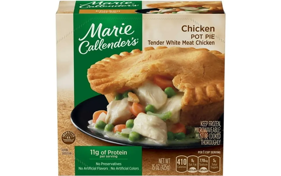 The marie callender s chicken pot pie would be a great addition to your meal menu. With chicken carrots peas and celery in a golden flaky crust this pot pie makes a good meal option. Available in a bulk case of 8 packs the marie callender s pot pie would be a great buy for restaurants cafeterias and hypermarkets. The marie callender s chicken pot pie would be a great addition to your meal menu. It is loaded with chicken carrots peas and celery. Available in a bulk case of 8 packs the marie callender s pot pie would be a great buy for restaurants cafeterias and hypermarkets. Warm up with a delicious comforting marie callenders chicken pot pie. Made with tender white meat chicken savory vegetables and made from scratch gravy all wrapped in a golden flaky crust. With 11 g protein per serving and no preservatives artificial colors or artificial flavors this convenient meal can be microwaved or heated in the oven. Enjoy this warm hearty and delicious comfort food today.