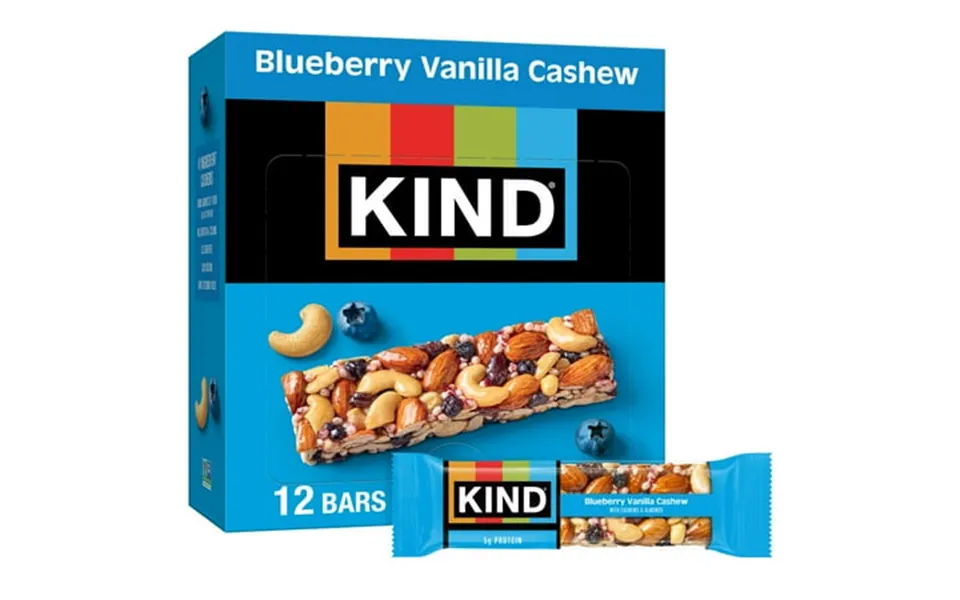 Kind blueberry vanilla & cashew bars are satisfying gluten free bars packed with nuts and blueberries that you can take anywhere. These kind nut bars lead with cashews as the 1 ingredient. Kind bars blueberry vanilla & cashew contain 5 grams protein and are a good source of fiber. This kind nut bar is also gluten free has a low glycemic index and is made without genetically engineered ingredients. Contains 12g of fat per bar. It s the perfect nutrient-dense pick-me-up when life gets in the way. Twelve 1.4 Oz kind healthy snack bar blueberry vanilla cashew gluten free bars in regular sized cardboard box.