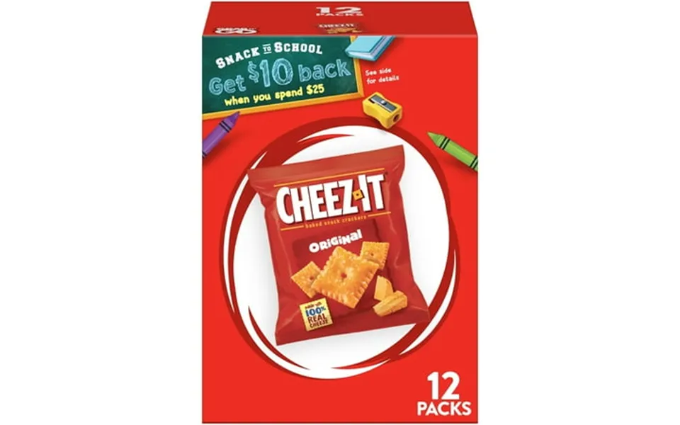 Outrageously cheesy and perfectly portable these pouches of cheez-it baked snack crackers contain deliciously crunchy little crackers that have captured cheese-lovers for decades. Discover a crowd-favorite snack made with 100% real cheese baked to crispy perfect for an irresistible taste in every crunchy bite. Each lightly salted crisp is loaded with a burst of cheesy flavor cheez-it baked snack crackers are an on-the-go fan-favorite for game night school snacks family movie nights late-night snacking and so much more the cheesy options are endless. Delicious for all ages grab a pouch of cheez-it original crackers for every family snacking moment. Whether you re packing them in school lunches grabbing some for the office or taking along on a road trip you ll find a delicious crisp snack that is filled with big cheese flavor. It’s no wonder that these bite-sized crackers have become a crowd-favorite bringing smiles and that urge for just one more handful. Contains wheat milk and soy ingredients. Shelf-stable. Cheez-it original cheese crackers baked snack crackers 12 count: