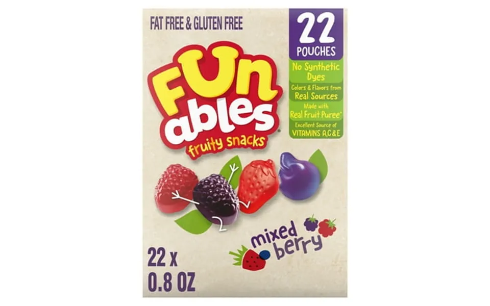 Snack time just got a whole lot funner. Funables mixed berry flavored fruity snacks are the delightfully chewy berry-shaped fruity snacks made with real fruit purée no synthetic dyes and a whole bunch of feel-good vibes. Each box includes 22 individually wrapped 0.8 Oz packs of fruity snacks sweetly shaped like strawberries blueberries and raspberries to match the berry flavors packed inside. Whether you re packing snacks for kids in lunchboxes handing out individually wrapped snacks at parties or stocking up on road trip treats for backseat snack attacks funables brings the fun. These fruit snacks are the sweet spot between delicious and doable so go ahead toss a few in your bag and turn everyday moments into snack-sized wins. When it comes to fruity snacks funables make snack time the best time. Parents love the goodness. Kids love the yum. Everyone wins. Have fun and eat it too. Have fun and eat it too with funables fruit flavored snacks. Convenient for everyone funables makes snacking easy at anytime and anywhere.
