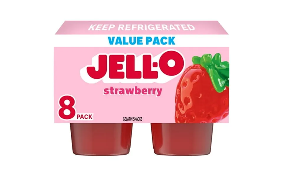 Jell-o original strawberry artificially flavored ready-to-eat gelatin snack cups deliver the great taste of jell-o gelatin in an on-the-go cup. Our colorful jiggly treat comes in individual snack cups perfect for putting into a lunchbox eating on the go or snacking at home. Add some wonder to your day with a delicious convenient snack. Our refreshing gelatin treats your taste buds to juicy strawberry artificial flavor made with fruit juices and without high-fructose corn syrup. Each jell-o cup contains 70 calories per serving. Each 27-ounce sleeve contains eight gelatin cups for quick and easy snacking. Spoon up a smile with jell-o original strawberry ready-to-eat gelatin snack cups.
