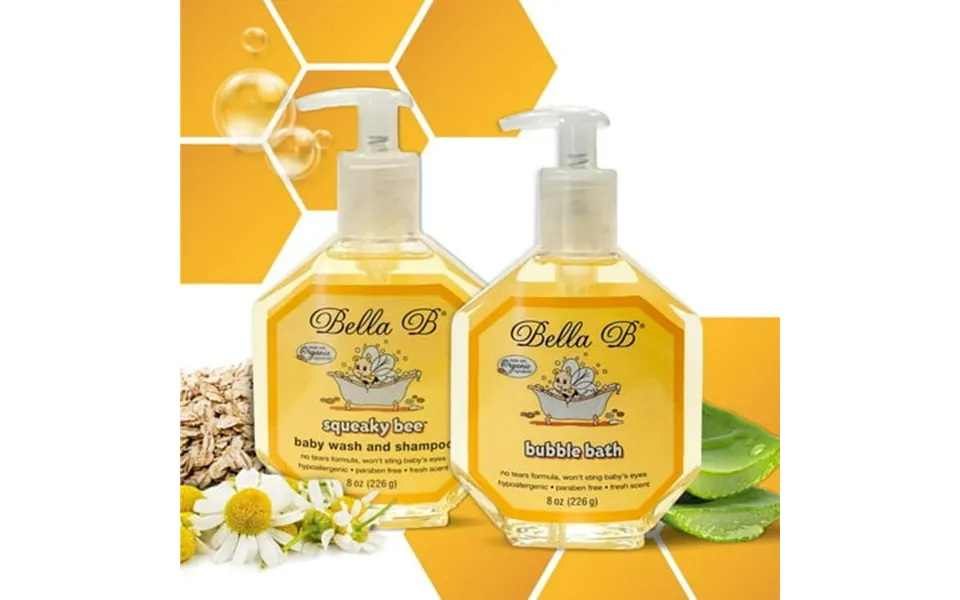 Squeaky bee baby wash & shampoo: bella b squeaky bee is a light fresh daily hair and bodywash gentle for baby and perfect for mom. Wonderfully fresh light scent and free of parabens artificial preservatives . Ph balanced hypoallergenic formulation no soap cleanser will not sting. Gently cleans the skin. Moisturizing formula includes: organic aloe vera vitamin e oat extracts and amino acids as well as several organic flower extracts. Use daily in bath or shower. Bubble bath: bella b bubble bath is a refreshing treat for baby and great for mom too wonderful refreshing fresh scent and free of parabens artificial preservatives . Tear free hypoallergenic formula. Made with several organic flower extracts including aloe vera matricaria marigold lavender and lemon verbena. Pour under running water for generous foaming bubbles.