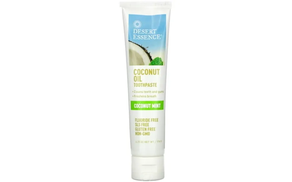 Desert essence coconut oil toothpaste 6.25Oz sold as single and value multi-packs. Buy in quantity and save fluoride free gluten free non-gmo sls free leaping bunny certified dessert essence coconut oil toothpaste is a refreshing blend of oils and extracts that provides complete care for teeth and gums. Organic virgin coconut oil is widely used to help remove impurities from the mouth.* Baking soda and sea salt effectively but gently clean teeth while zinc citrate helps reduce buildup. Australian tea tree oil helps defend against sugar acids. A fresh burst of mint provides a sweet fusion for complete oral health. *When using coconut oil toothpaste mouthwash and oil pulling rinse. Suggested use for adults and supervised children 2 years of age. For best results use twice daily. Other ingredients calcium carbonate purified water aqua glycerin melaleuca alternifolia tea tree leaf water carrageenan virgin cocos nucifera coconut oil* aloe barbadensis leaf juice hamamelis virginiana witch hazel extract mentha viridis spearmint leaf oil sea salt calcium ascorbate zinc citrate melaleuca alternifolia tea tree leaf oil magnesium chloride sodium bicarbonate sodium lauroyl sarcosinate xylitol natural flavor aroma . *Certified organic warnings keep out of reach of children under 6 years of age. If you accidentally swallow product contact a health care provider immediately.
