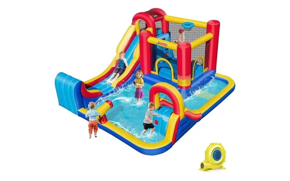 Why do you choose olakids bounce house a long surfing slide 2 splash pools a bounce house with climbing wall and basketball hoop and a small slide constitute this inflatable water park. It is made of 840d and 420d oxford material which is puncture-resistant to make sure that kids can have fun with this waterslide for kids backyard for a long time. The mesh walls around are able to keep children safe while playing with their families and friends in holiday. The summer outdoor water toy comes with many accessories including a water hose a carrying bag a repair kit and 7 bouncer stakes. It can be easily set up and take down in several minutes with 680w air blower and it is able to be stored in the carry bag for convenient movement. This jumping house can be used at outdoor space such as yard park and lawn. Features: made of premium 840d and 420d oxford cloth for long-lasting serve life recommended for 4-5 kids aged 3 years old and the max weight capacity is 330lbs in tota with its bright colors and multiple fun design sure to be a hit for young children to play quick inflation and deflation with included 680w air blower suitable for both indoor and outdoor space such as garden backyard park sweet accessories including a water hose a carry bag a repair kit and 7 ground stakes specification: net weight: 60 lbs material: 840d 420d oxford maximum weight capacity: 330 lbs recommended age: 3 years old product dimension: 177 x 154.5 X 85 l x w x h package includes: 1 x carry bag 1 ...