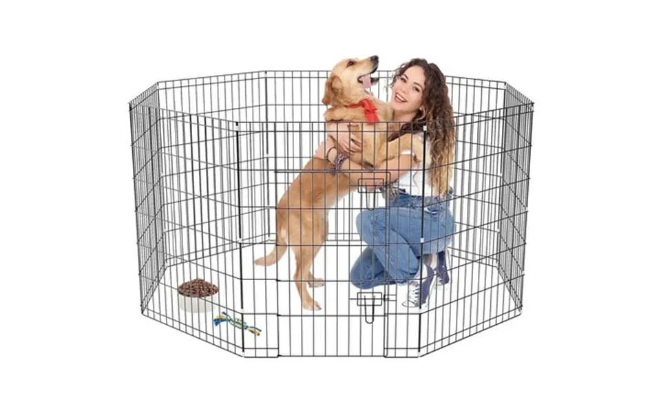 Dog playpen secure double latch step-through door access exercise pen pet playpen folds flat for convenient storage. Suitable for dogs up to 25lbs including chihuahua dachshund shih tzu cocker spaniel corgi french bulldog best height for dogs up to 23in.Each panel measures 24 w x 35.4 H dog playpen provides 16 square feet of enclosed area 1.5 Meters . 8 Panels exercise pen works great as a dog fence or as an exercise area for non-climbing small to medium animals including rabbits ducks turtles & guinea pigs and some other small animals. This interactive and expandable pet playpen for small pets provides large enclosed area for pets ensuring that they have enough room for play and exercise. 1. Constructed with a durable and sturdy powder-coated iron metal wire frame for long-lasting use and safety for your pets. 2. Provides a large 16-square-foot enclosed area with 8 connected panels giving your pets ample space to run play and exercise. 3. Suitable for a variety of small to medium pets including dogs cats rabbits ducks turtles and guinea pigs. 4. Foldable and portable design allows for easy setup transport and compact storage making it ideal for both indoor and outdoor use. 5. Adjustable and expandable configuration with 4 different shape options to accommodate your pet s needs. 6. Quick and easy setup with no tools required simply unfold the shape and connect the panels together. 7. Dimensions of each panel: 24 x35.4 With a total weight of 22.71Lbs.