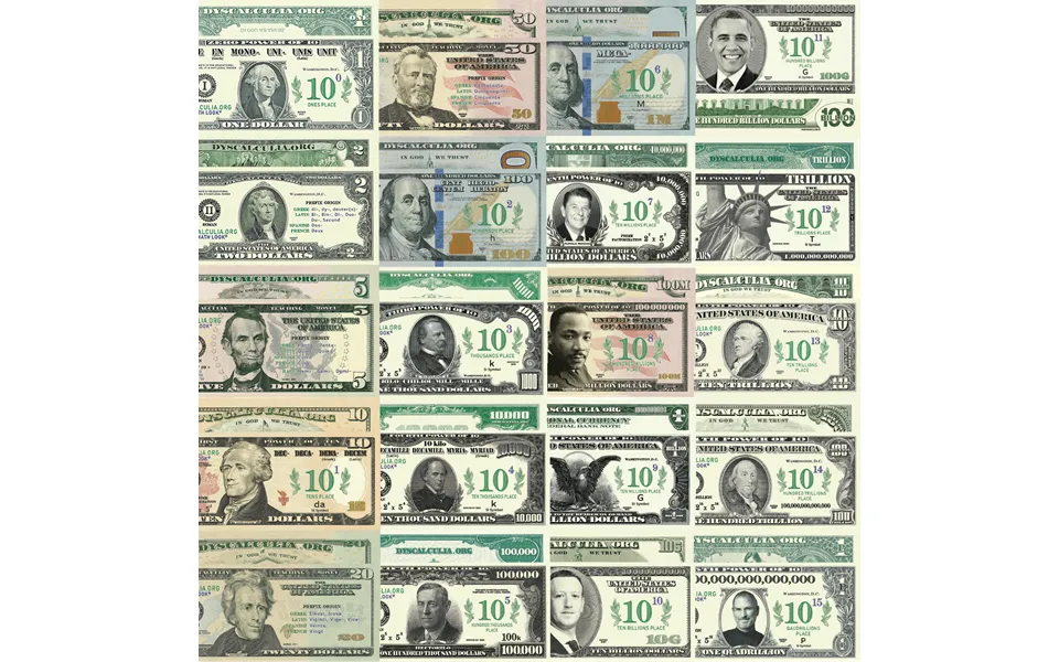 Math language-enhanced decimal place value chart included, excludes blue text shown over pictured chart. Receive ten of each of the following bills for a total of 200 double-sided bills: 1, 2, 5, 10, 20, 50, 100, 1,000, 10,000, 100,000, 1 million, 10 million, 100 million, 1 billion, 10 billion, 100 billion, 1 trillion, 10 trillion, 100 trillion, 1 quadrillion order the bills & chart as a set or order them separately. Designs are the same size as us currency and are created for educational purposes only. By purchasing this product you agree to use it in a legal manner. Please read our legal disclaimer. Learn more about dyscalculia here. Discount codes not applicable.