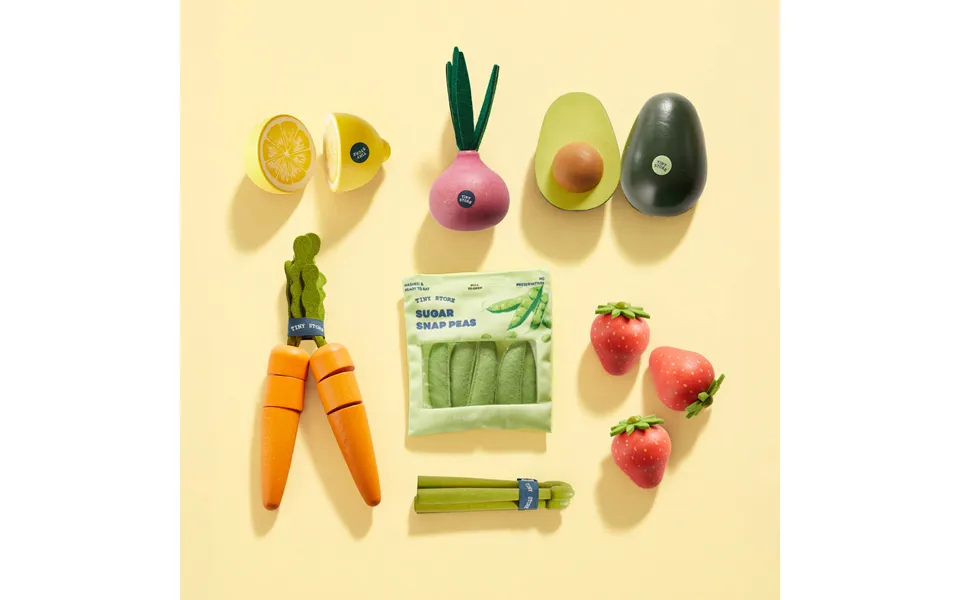 This handpicked produce set is packed with farmer’s market favorites from fuzzy strawberries to snappy peas. Designed with a mix of beech wood, felt, and cotton, it offers a beautiful sensory experience for little foodies. Whether chopping, peeling, or stacking, kids will enjoy healthy habits served in the most playful way. 7 Nutritious-inspired toys includes avocado, lemon, peas, asparagus, carrots, and more vibrant & realistic each piece features natural textures and true-to-life details that celebrate the beauty of real fruits and veggies. Learn through play encourage kids to identify colors, shapes, and food groups while reinforcing the idea of eating the rainbow. Multiple ways to play peel open peas, slice through carrots, or sort berries endless opportunities for tactile exploration. Crafted for tiny hands thoughtfully sized and safely finished, every item is durable and easy to grasp.