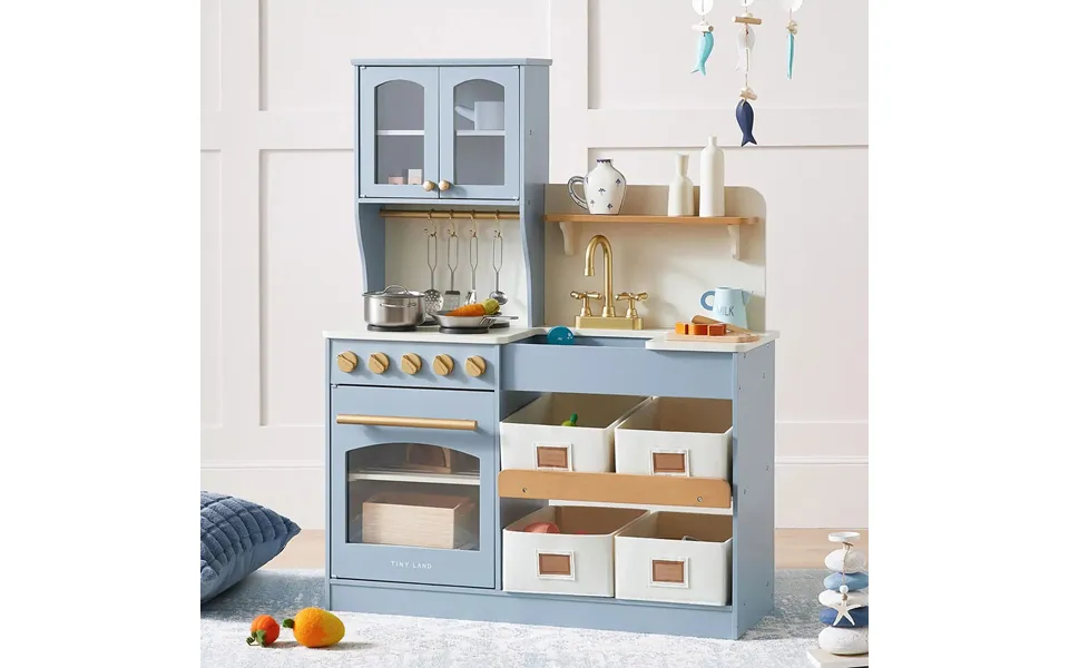 Features & benefits: get ready for a charming seaside-inspired adventure in your playroom presenting our tiny land multifunctional storage play kitchen in a calming sky blue. This delightful kitchen combines soft blue hues with natural wood and golden accents, evoking a breezy, coastal feel perfect for your child’s imaginative play. Budding master chefs can whip up their imaginary gourmet dishes with the cutest collection of pretend cookware. The highlight an imitation faucet that adds a dash of realism to their kitchen role-play designed with modern living in mind, this blue play kitchen blends style and practicality with smart storage solutions. Tall cabinets are ideal for showcasing elegant cups, while lower shelves keep everyday items close by. The transparent accents add a stylish touch, and the felt storage boxes make organizing an easy and enjoyable task for little hands. Our kitchen set not only stirs culinary passion but also creates a fantastic feast of skills. Your kiddos can develop innovative thinking, social interaction, and cooperative play through creative kitchen play. Now, that's a recipe for success sprinkled with humor, seasoned with charm, and crafted with eco-friendly materials this blue kitchen set is a toy your child will treasure. So, put on your imaginary chef hats, and let’s cook up some fun installation instructions installation video