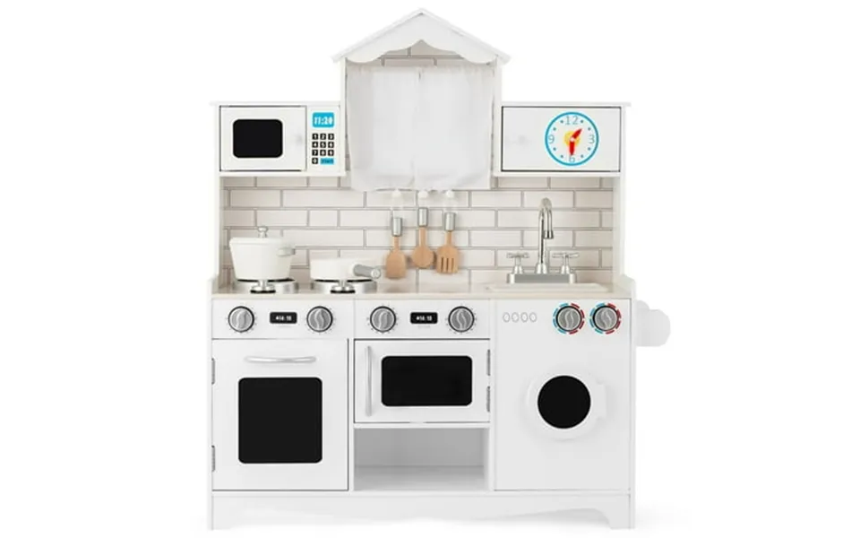 This children s kitchen is a brand-new design which contains complete cooking cookware including microwave oven stovetops sink towel rack and washing machine so that children can truly feel the joy of cooking. And our kitchen design is very thoughtful. All the cabinet doors have handles turn the knobs with click sound and the stovetops design is completely realistic. A lot of cupboard doors in the kitchen are open so there is a lot of room to storage. Of course our kitchen is easy to install and clean. Such a kitchen is the perfect place to develop your child s cognitive skills social skills and hand-eye coordination. Features complete kitchenware including microwave oven stovetops sink towel rack etc thoughtful details add authenticity to your kid s cooking the clock on the cabinet helps the child know the time ample storage space each cabinet can be opened for storage develop kids hand-eye coordination and social skills it s a great gift for children easy to install and clean specifications: color: white material: mdf pp product dimension: 30.5 X 11.5 X 36.5 L x w x h net weight: 28.5 Lbs suitable age: 3 years package includes: 1 x kids kitchen playset 1 x pot with lid 1 x pan 3 x cooking utensils 1 x user manual