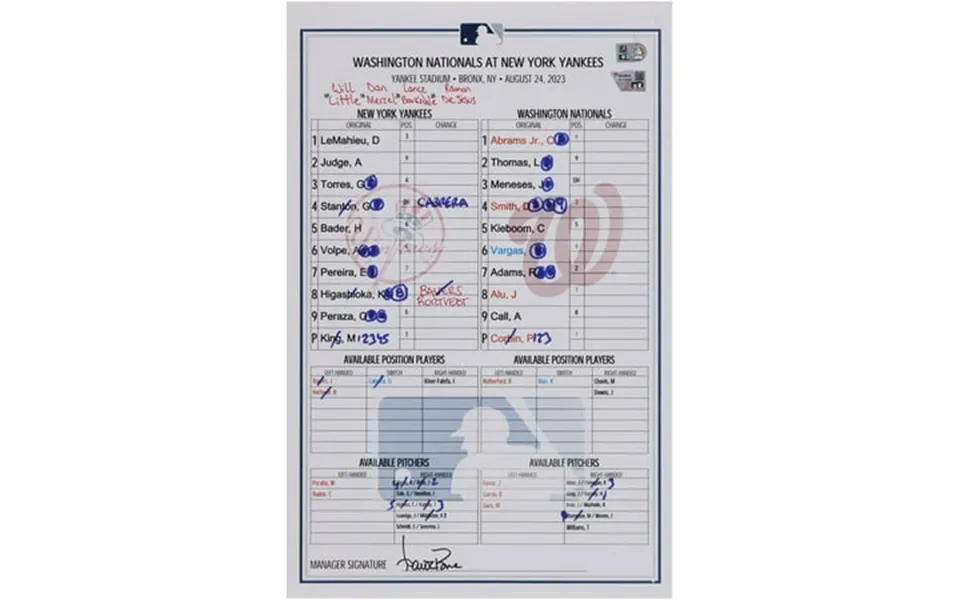 Fanatics authentic certified New york yankees game-used lineup card vs. Washington nationals on august 24 2023 Everson pereira first career hit