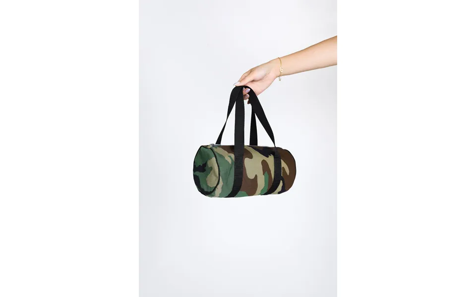 Camo mini duffle style handbag upcycled from the scrap material of the rework camo mini skirt. Lined with zipper closure.. Sourced and reworked in canada....show more