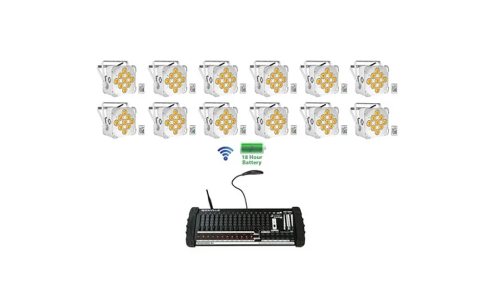 Package includes: 12 rockville best par 60 white rgbwa uv battery powered wireless dmx wash par light 1 rockville rockforce w4 384 channel wireless dmx lighting light controller midi video of best par 60 white: features: rockville best par 60 white rgbwa uv battery powered wireless dmx wash par light 100% true wireless built in 2.4Ghz wireless dmx 512 receiver allows you to link multiple lights together without wires built in rechargeable battery allows you to use the lights without plugging them in making your setup 100% wireless light source: 9 leds 6 watts each led each led is a 6-in-1 rgbwa uv red green blue white amber ultra violet dmx control: 6 or 10 channels dmx input and output 3 pin 50 000 hours life expectancy irc wireless remote control included super bright: 6500 lux 1m way brighter than others on the market large color 4-digit digital lcd display for easy color mixing & operating. Our interface is the easiest to use on the market easy to operate with the large lcd display remote control dmx controller built in programs and sound activated mode easy color mixing on one screen led angle: 30 degree or 5 built in 13 200 mah lithium battery battery indicator on lcd display so you know how much longer your battery will last single color run time red: 18 hours green: 14 hours double color run time: 7 hours all colors run time: 4 hours recharge time: 6 hours battery will still perform optimally even after hundreds of charging cycles battery overcharge protection pow...