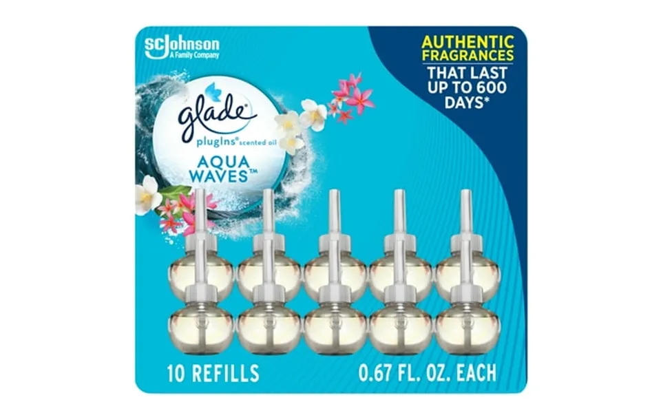 Create a fresh ocean atmosphere with our glade aqua waves plugins air freshener for home. Crafted by master perfumers with notes of sea salt sparkling mandarin blue lavender tropical flowers and jasmine. Make a splash with our scent diffuser and change the mood with 2x more adjustability vs. Previous glade warmer . Express your mood with electric oil diffuser in aqua waves fragrance. Simply remove the cap from the refill and insert it into the glade plug in warmer. Plug the warmer into an outlet and adjust the level of fragrance to create the mood you want. Feel right at home with glade s plugin air freshener and fragrance infused with essential oils.