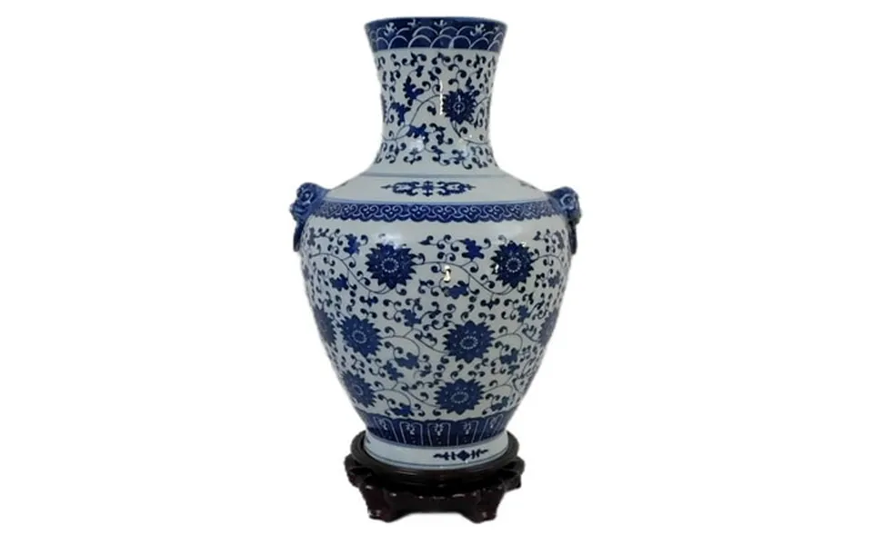 This blue and white medium sized vase is glazed in a floral vine design and can be used as the focal point in your home. Use them as a flower vase to add a asian touch in your design plans. Adored with vine flowers and leaves to make a rhythmic design painted in cobalt blue on an white background. Added flair with fu-dogs with rings shaped handles. Imported from china and made in the ancient porcelain capital of beijing. Deep rich colors adorn this watertight vessel that can be used on a table top. This handmade item is rare and limited in supply. 11 Diameter at widest x 10 x 16.5 High base 5.5 Opening 5 rare hand painted water tight glazed painting stand not included chinese porcelain