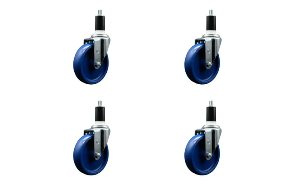 Listing is for a set of four 4 service caster series 20 1-3 8 expanding stem stainless steel swivel casters with 5 diameter by 1-1 4 wide blue solid polyurethane wheels capable of supporting a total weight of 1 200 lbs. 300 Lbs. Caster. . When searching for a reliable and durable solution to your caster needs look no further than the service caster series 20 expanding stem solid polyurethane wheel casters. The series 20 features an innovative expanding stem that can easily adapt to the inside diameter of the opening allowing for a secure fit in round or square tubes. Simply tighten the topmost knurled nut to compress the rubber for a snug fit. For added security further compress the rubber with a wrench via the nut under the swivel raceway. Finely crafted with a bright zinc plated finish heat-treated ball bearing raceway and a solid polyurethane wheel this versatile caster is ideal for work tables shop projects or any equipment with round or square tube legs. Service caster is unsurpassed in quality reliability and excellent customer service. Count on us to move you forward.