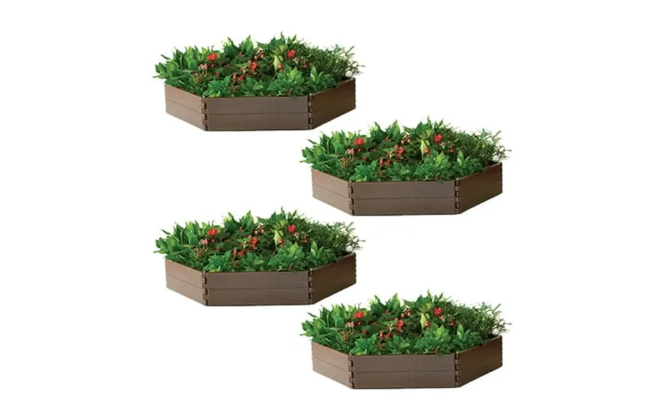 Set of 4 kits 24 panels . Modern home hexagon raised garden bed kits are a new modular design that will simplify your gardening. Constructed of uv-resistant high-density polyethylene hdpe each kit includes 6 panels allowing you to quickly snap together a garden bed in minutes. The hdpe material will not crack rot warp or splinter like traditional wooden garden beds. The walls will absorb heat from the sun and help retain the warm temperature needed for your plants to develop. The modern home hexagon raised garden beds are stackable with interlocking supports allowing you to make deeper planters as well. Stacking 2 high will give you 16 tall outer walls. Backed by the manufacturer 5-year limited warranty each kit is durable and designed to last for years. Each kit can be assembled in a 48 diameter x 8 tall hexagon size or in a 49 x 25 x 8 rectangle. Assembles using included locking pin stakes which will hold the planter into the soft ground when staked in place..