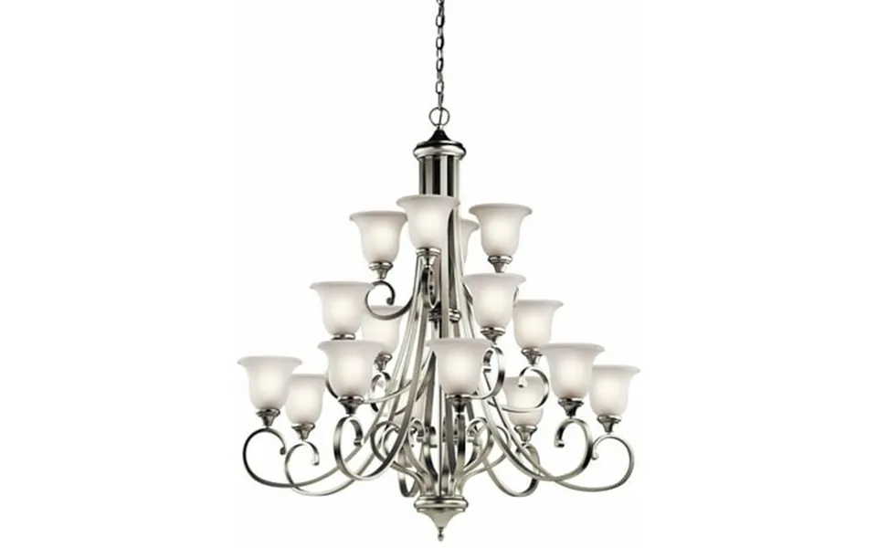 Collection: monroe material: steel finish color: brushed nickel width: 45 height: 48.25 Chain length: 72 lamping type: incandescent number of bulbs: 16 wattage: 75 watts moisture rating: dry rated desc: this 12 light chandelier from the monroe tm lighting collection is a unique twist on traditional americana. The distinctive metal base is touched with a brushed nickel tm finish which beautifully complements the light umber etched glass adornment. With this design we have turned tradition on its head to create an updated look. Chain length: 72.00.