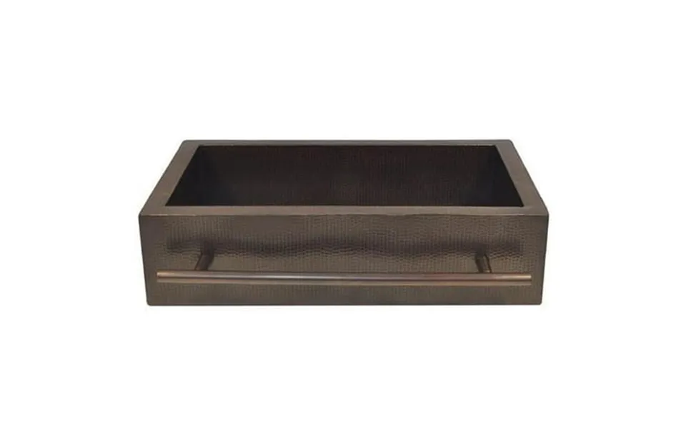 Their beauty will be the centerpiece in your kitchen creating a unique atmosphere of elegance at home. Manufactured by our master craftsmen with the highest quality made from pure solid and 100% recycled copper plus we can create a special design on the apron sink according to our clients desires. Our products meets the highest quality standard we fabricate functional products to make your life easier that is why our products requires little maintenance and their installation is easy. Specifications color: dark brown material: copper design: towell bar lip size: 2 drain size: 3.5 Shape: rectangular gauge: 16 gauge installation: undermount inside length: 32 inside width: 18 outside dimension: 9 h x 22 w x 36 l