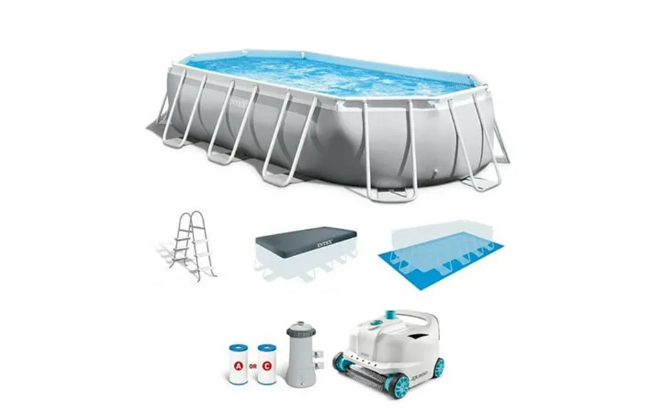 The intex 148.5 Square foot prism frame outdoor oval above ground swimming pool set with filter pump pool cover ladder and robot vacuum has everything you need to get the backyard pool parties going this summer. The upscale seafoam blue above ground pool comes with a cartridge intex model 28635eg filter pump a ladder ground cloth robot vacuum cleaner and a debris cover. All the party is missing is your friends and family prism frame pools are enhanced with strong powder-coated steel tubing. They re durable and still easy to assemble. The liner is stylish and constructed with puncture-proof 3-ply material for many years of backyard fun. The 16.5 X 9 x 4-foot coverage can fit a ton of people to boot. The included robotic pool vacuum keeps your above-ground pool s water crystal clear and uncloudy letting you dive in on a whim and take the edge off the dog days. Its built-in filter siphons the water down to 0.15Mm trapping dust dirt leaves and more for convenient disposal in the removable half-gallon filter basket. Start your summer off with a complete above ground pool set with the intex prism frame oval swimming pool pump set to enjoy the sun’s rays while splashing in the water. Disclaimer: please review your hoa rules and restrictions before purchasing this product. Not all housing agencies permit private above-ground pools.