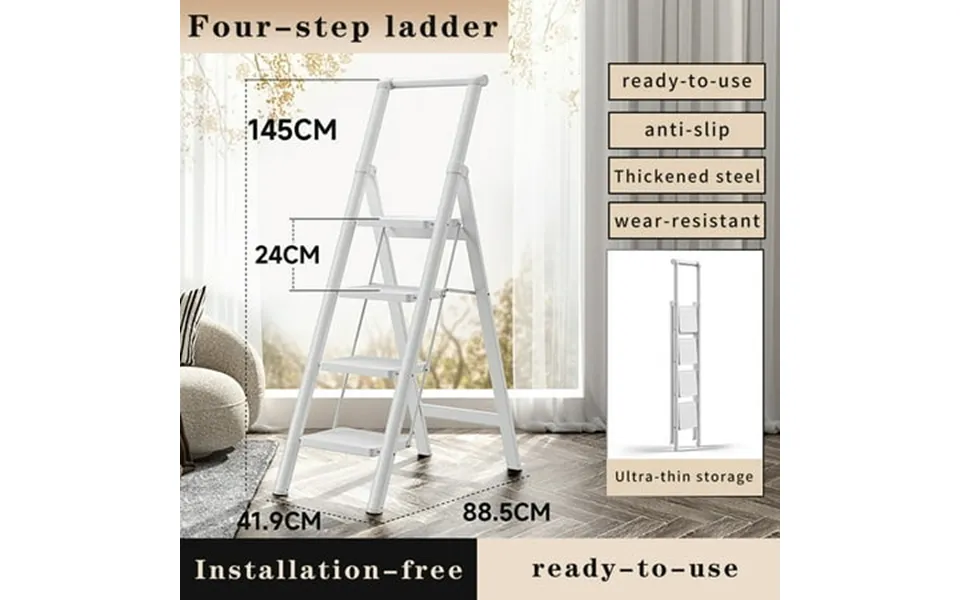4 Step ladder foldable step stools for adults with wide anti-slip pedal 330.7 Lbs 150 kg lightweight sturdy steel ladder convenient handgrip portable folding ladder for home kitchen office white with handrail feature: 1. White: romantic and gentle. Combining white purity with elegance. 2. Installation free design: ready to use with no installation required. 3. Waterproof scratch resistant and rust resistant: adopting a new baking paint process it is durable and long-lasting. 4. Bidirectional anti slip foot mat: horseshoe shaped foot mat silent anti slip not damaging the floor. 5.20Cm widened pedal: integrated molding compressive and fracture resistant. The pedal area is sufficient for both feet to stand simultaneously. 6. The surface has uneven and non slip texture ensuring no slipping when climbing high. 6. Upgrade wear-resistant joint components triangular mechanical stable structure embedded reinforced crossbeam. 7. Thicken the carbon steel pull rod to ensure smooth and non jamming of the unfolded wire. Folding and unfolding without any abnormal noise no jamming or stretching resistance. Steadily and steadily climb high with peace of mind at every step. 8. Easily climb high to take care of household chores organize storage and clean glass. 9. Multi purpose stool flower rack storage rack 10. Storage does not take up space with a folding thickness of only 5cm and can be easily stored behind the door under the bed or in gaps. 11. The ultra light ladder body weighs 5.3Kg m...