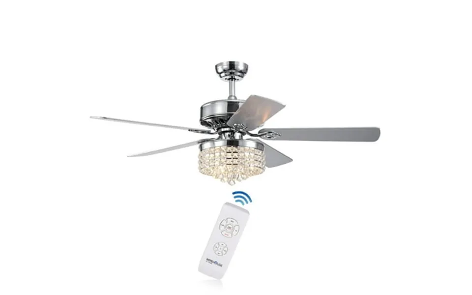 Manufacturer part number: cfl-8358remo ch ceiling fans are the most cost-efficient option to bringing the temperature down and moving stale air out of your room. This lighted chandelier ceiling fan is the perfect solution for your cooling and lighting needs. Chrome silver finish and a full crystal shade combine to fill your home with a grandeur rarely found in such a functional package. The matching silver stained wooden blades move an impressive amount of air. The three speed reversible motor insures you find the exact setting for your stimulating comfort. Item dimension: 52 x 19 x 52 in item weight: 23 lbs