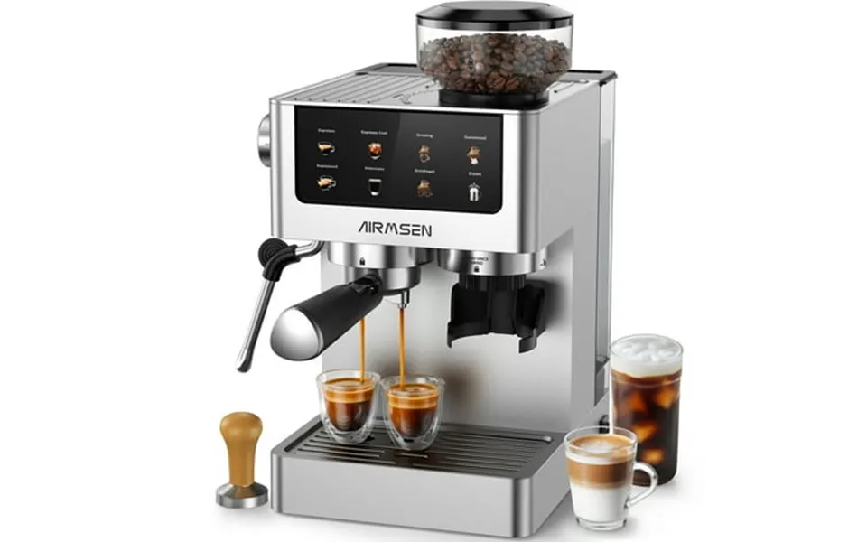 Airmsen espresso machine with grinder grind brew froth all in one machine craft café-quality drinks right at home with our barista-quality espresso machine. Featuring a sleek stainless steel exterior & compact size airmsen espresso machine fits perfectly on any kitchen counters. Adjust grind levels to get your preferred coffee strength. 1350W heating power brews a steaming-hot cup in under one minute ideal for those busy mornings. Detachable conical burr grinder is designed for clog-free grinding and hassle-free cleaning saving a lot of repair costs 63oz large water tank brews multiple cups without constant refills. Enjoy barista-style espresso lattes cappuccinos or americanos hot or iced.