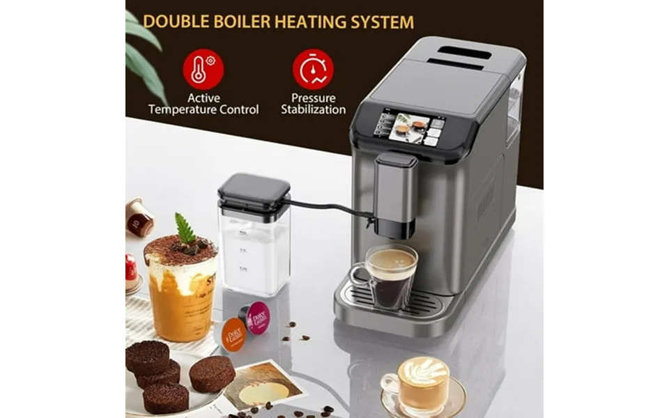 Brew barista-quality drinks in your pajamas with the aoile 20-bar dual boiler espresso machine. Designed for busy households and compact kitchens this fully automatic coffee maker features a built-in grinder a sleek touch panel for one-tap brewing and a self-cleaning system that saves time and effort. Simultaneously brew espresso and steam milk with professional precision ideal for hectic mornings late-night work or anytime you need rich fresh coffee on demand. Specifications: brand: aoile color: gray & gold material: stainless steel & abs coffee maker type: espresso machine special feature: programmable dual boiler lcd touch panel self-cleaning capacity: 1.5 Liters product dimensions: 21.06 D x 10.24 W x 16.14 H item weight: 23.5 Pounds power source: electric room type: kitchen office assembly required: no