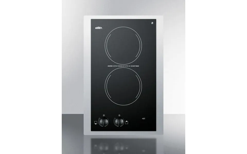 Summit cr2110tk15 is a two-burner 115v electric cooktop that brings outstanding value to kitchen counters.Made from eurokera ceramic glass the cr2110tk15 offers modern style and convenience with an easy-to-clean jet black cooking surface. Two 1200w radiant elements feature a 6 diameter manufactured by e.G.O. Of germany. Push-to-turn control knobs provide infinite heat control. A residual heat light indicates when the surface is still hot. This unit is made in europe and includes a stainless steel trim kit that allows the cooktop to be installed in 15 wide counter cutouts. An identical model is available with 230v operation see the cr2220tk15 . Also available with one and three burners summit cr electric cooktop series offers top performance in a quality design.