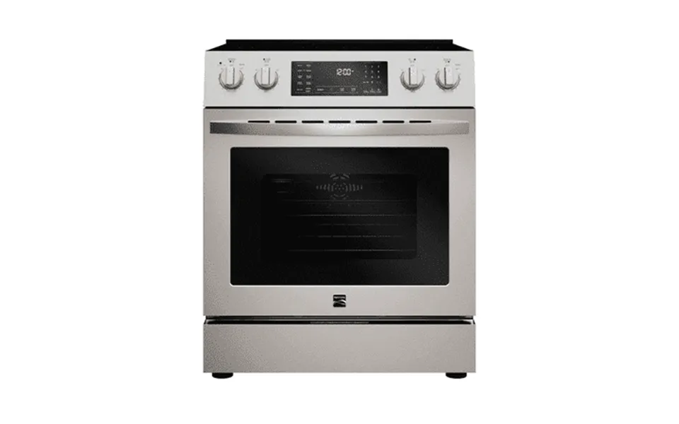 The kenmore front control electric range enhances your cooking experience with its front-control design 5 cooktop burners 2 oven racks and bright halogen light while its sleek and modern stainless steel finish complements any kitchen. The easy-to-use controls feature accurate incremental adjustments and advanced cooking and self-cleaning options and the 5 cooktop elements including two dual ring elements giving 7 power options to maximize cooking flexibility and control so you can set the task and boil water sauté veggies and simmer sauce all at the same time. True convection utilizes a fan and third heating element to preheat quickly and surround food with heated air for a consistent even performance on every rack. The air fry setting with a basket produces hot circulating air to create your favorite fried foods with a crispy outside and tender inside without the oil or mess and the 2 powerful 3 000-watt turbo boil elements provide fast boiling stir-frying and searing options to get that perfect sizzle on everything.