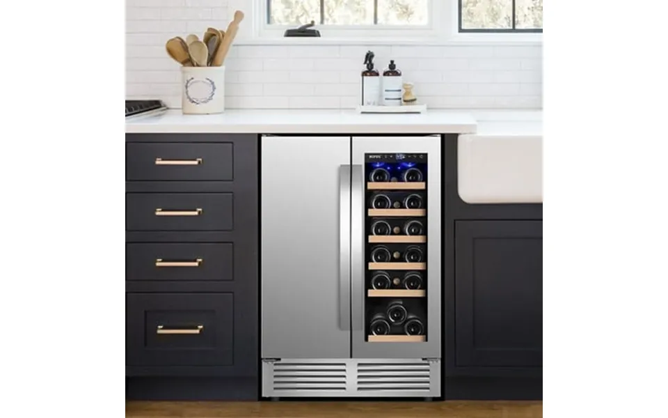 Nipus dual cooling zones beverage and wine refrigerator with a sleek design and capacity for 57 cans and 18 bottles. Whisper-quiet the compressor may produce up to 38 dbs ecibels of noise during operation for some time. Once the internal temperature of the fridge reaches the desired level the compressor noise should drop to below 20 dbs. Therefore during normal use this wine beverage cooler should be quiet. Featuring stainless steel and tempered glass doors this beverage refrigerator seamlessly blends with any decor. Dual-zone intelligent temperature control system nipus wine cooler beverage cooler has built-in circulating cold air system makes the wine cooler has steady tempreture stable refrigeration without fluctuations.And these dual zones can work independently if you just want the wine zone work you can just open the one side .There is no effect on the beverage cooler area.The left cooling temperature range of 35 -50 while the right zone offers a range of 41 -64 .This built-in circulating cold air system transporting cold air to every corner ensuring that every bottle of wine is at a suitable temperature. Unlike other undercounter wine and beverage refrigerator the wine fridge under counter area of this also uses wooden shelves.Utilizing advanced technique the beech wood shelves are nice looking and strong enough steel ball slide rail extra-wide wooden board super load-bearing capacity easy to take wine.But actually the space can suitable for larger bottles you also...