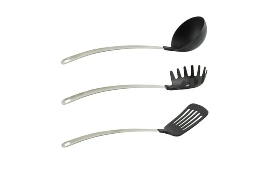 This three piece set of kitchen utensils from imperial home will make the perfect addition to any kitchen. You will receive a ladle a slotted spatula and a spaghetti pasta serving spoon. The durable kitchen tools combine nylon heads with stainless steel handles. The nylon heads are heat resistant to 410 f 210 c and safe to use in all pans. The versatile slotted turner is perfect for flipping and cooking and allows moist foods to be handled while excess liquid drains away through the slots. The pasta serving spoon is a unique tool that is forked so you can easily grab noodles and has a hole in the center to drain water away. A kitchen ladle is essential for serving up soups stews and sauces. The set is dishwasher safe. Measurements in length: 12-1 4 ladle 13-3 8 slotted turner 12-1 2 pasta spoon.