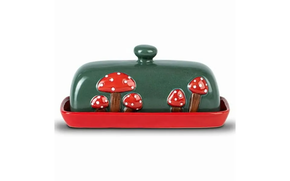 Nature style showy mushrooms suspend over the butter dish lid and stand on the butter container bottom like fungus stand amongst red soil on this woodland. Playful mushroom shape butterdish with lid for all the woodland lovers that will bring magic to any kitchen. Craftsmanship the mushroom butter holder with lid is hand modeled and decorated by craftsman molded with high pressure and glazed with colorful glazes refined at high temperature for more than 8 hours which nnly present an exquisite artistic daily necessities for customers. Decorate room this butter holder for counter is essential for kitchen or restaurant the colorful large butter dish well matches with kitchen items the mushroom shape decorate your kitchen well which is suitable as a decorative object on any coutertop. High quality this covered butter dish is made of high-grade kaolin for food safe high-fired to make porcelain it s possible to wash it in the dishwasher although hand washing handmade pottery is always recommended. Dishwasher and microwave safe.