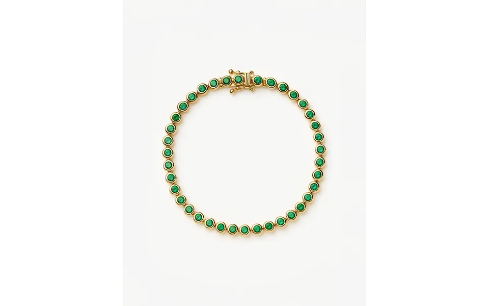 Stock will be available early august, sign up below to be notified when it lands.. Cubic zirconia in gold and silver still in stock.. The classic you love, updated with a colourful twist. This luxurious bracelet features beaded detailing and is embellished with rounded faceted emerald green nano-crystals, perfect for may birthdays. The classic box clasp has both a double-ridged push-button closure and a lever closure for added security. Let it shine solo or team with chunky chains for an instant arm stack.. How to open & close the clasp. Secure your bracelet by inserting the tongue into the clasp until there's a 'click' sound, then clip the arms down on both sides of the clasp. In order to take off your bracelet, unclip the arms and pull away from the sides of the clasp. Release the tongue by pressing the button.. Metal: 18k recycled gold vermeil on recycled sterling silver. Gemstone: emerald green nano-crystal. Gemstone dimensions: 2.5Mm. Chain type: tennis. Chain width: 3.9Mm. Chain height: 3mm. What are nano-crystals . Nano-crystals are innovative, lab-created stones that are designed to mimic the look of natural gemstones, without the impact of mining.. This bracelet is a fixed length and can't be adjusted. If you prefer a looser fit, we recommend sizing up.. S. Total bracelet length: 160mm. Weight: 9.7G. M. Total bracelet length: 180mm. Weight: 10.7G. L. Total bracelet length: 200mm. Weight: 11.7G. Product code: te-g-b2-gncz