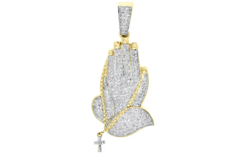 This eye-catching praying hands diamond pendant is crafted in solid 10k yellow gold & shimmering white diamonds ensuring sparkle from every angle. Radiant with 7 8 tcw t.W. Of genuine diamonds this pendant is high polished to a bright shine. Exclusive style has a well built frame with caged back to withstand everyday wear and tear. The diamonds are securely held between the gold mounting in a pave setting close together making the overall appearance larger and lustrous. Diamond bail to match and give this exclusive pendant a high end custom look. These are all 100% genuine round diamonds. All the diamonds are of same clarity and color throughout. This great size men s pendant is 1.70 Inches in length and weighs approx. 6.7 Grams. This one of a kind piece would make a perfect addition to your jewelry collection. 6.7 Gr. Of 10k yellow gold total carat weight: 0.88 Tcw t.W. Of white diamonds length: 1.70 Width: 0.90 Clarity: i1