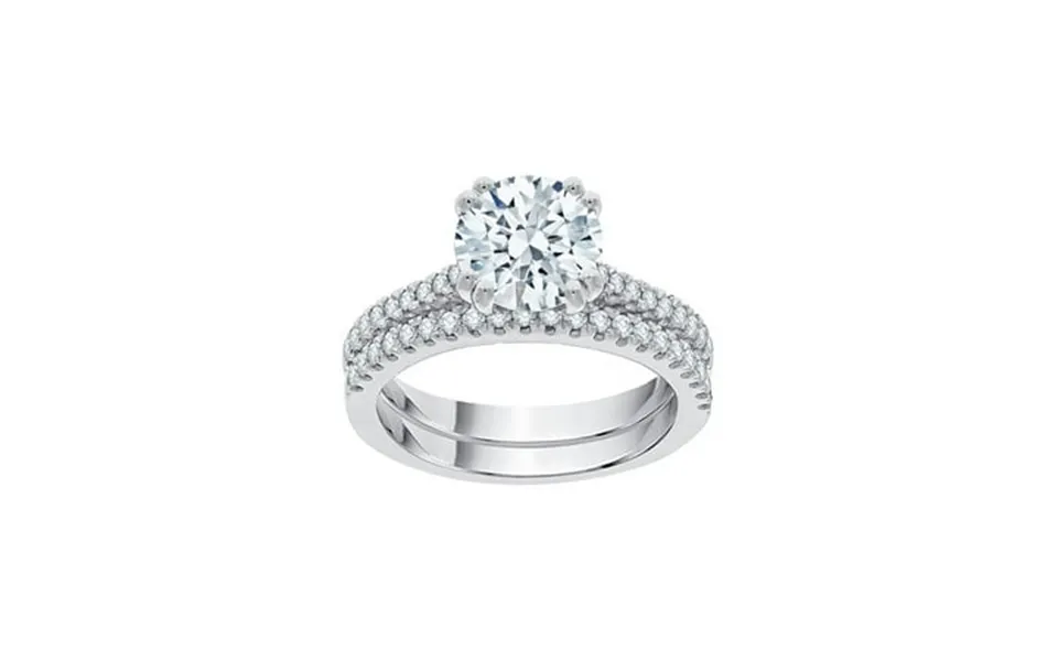 This exquisite bridal set engagement ring is adorned with a large solitaire round diamond center stone the 14k gold band is accented by round diamonds...show more