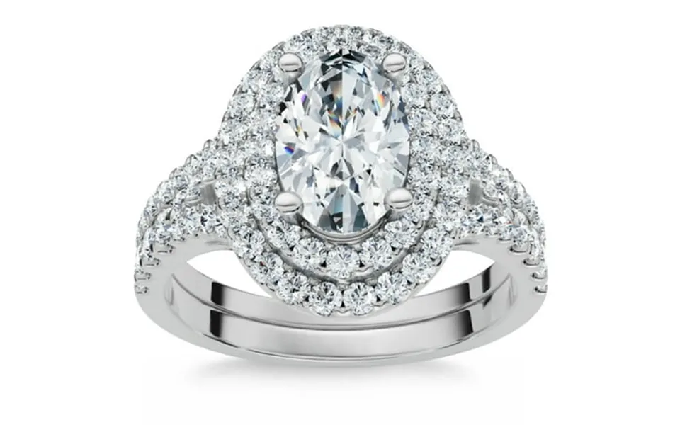 Fine jewelry hand made by pompeii3 in our usa factory. Pompeii3 represents the best knowledge in the industry as well as the forward-thinking design-driven principles of providing ethical sustainable and timelessly beautiful jewelry of exceptional craftsmanship. Womens ring features one round brilliant cut genuine 1 carat oval lab grown diamond. The center stone is accented by round cut genuine lab grown diamonds. The diamonds are prong set in solid 14k white gold high polished mounting. Matching wedding ring is included. -- Finger size